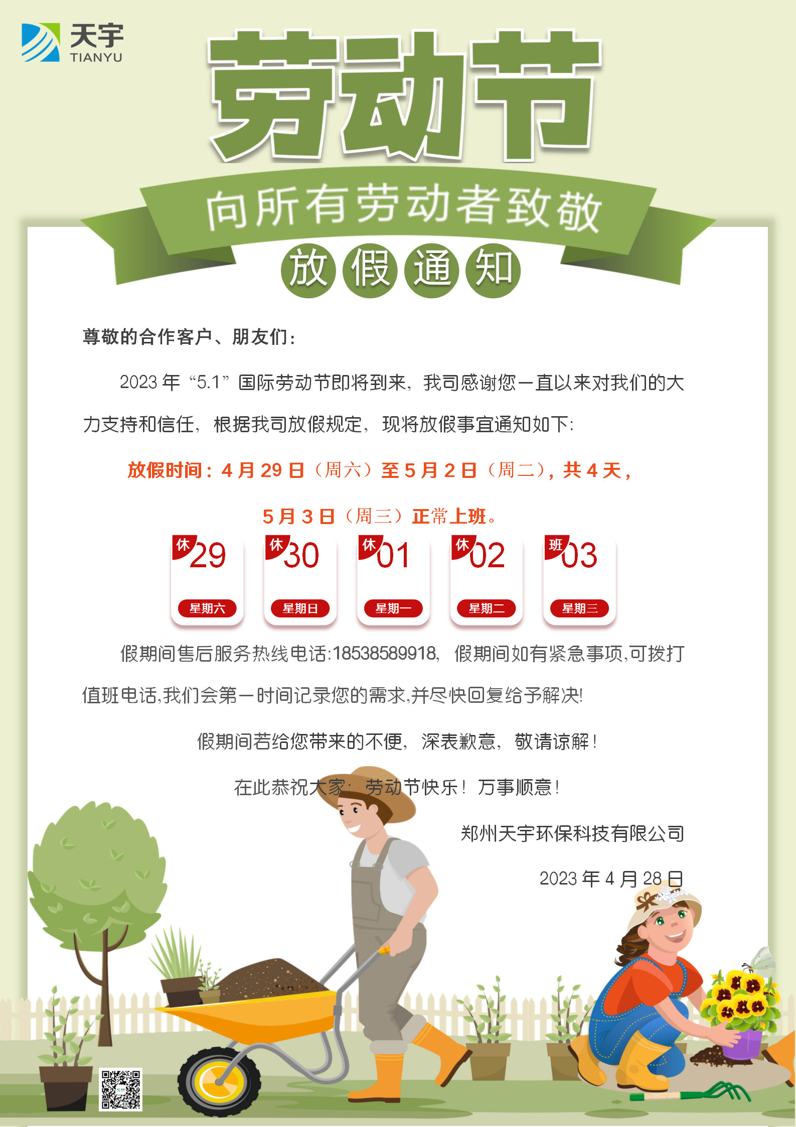 【鄭州天宇】五一勞動節放假通知
